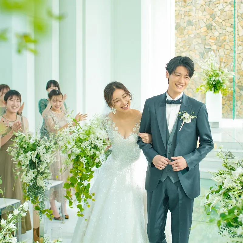 結婚式準備のダンドリをわかりやすく説明♪挙式のイメージが湧くガラス張り純白チャペル入場&ゲストと貸切ガーデンや人気の階段入場まで結婚式シーンを体験♪\初めての見学予約は挙式料全額OFF/その他特典あり♪